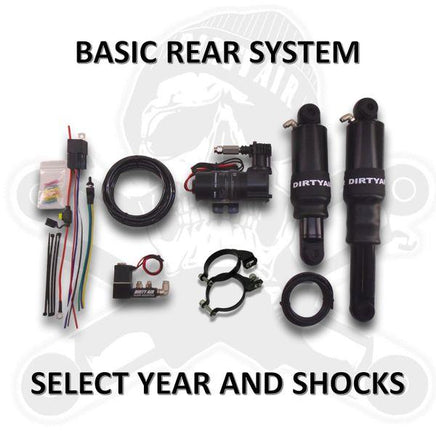 DIRTY AIR Complete rear air suspension system.  Redesigned for optimum performance, reliability and ease of install. Fits Harley touring models 2020-down.  This is a complete system assembled to easily replace your stock touring shocks with height-adjustable air shocks.  This system will allow you to lower your bike 2 to 3 inches from stock height with all of the air released, and air it up to stock ride height for a smooth ride in a matter of seconds.